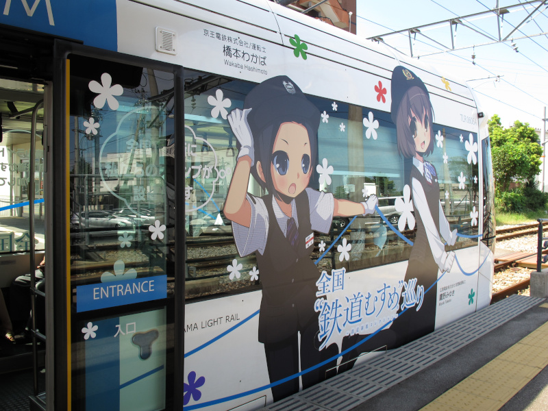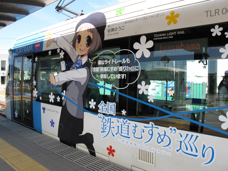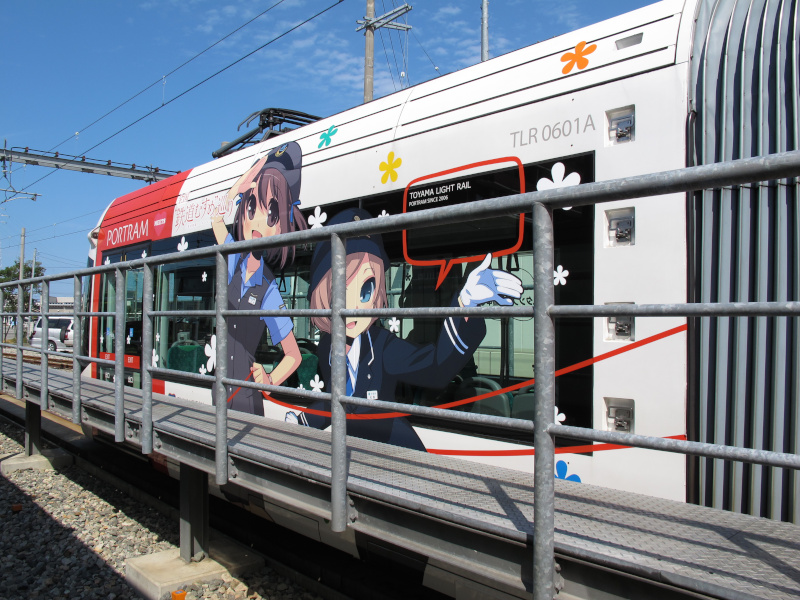 鉄道むすめラッピング電車(2013/09/10撮影) 2013年1月から9月まで開催されていたスタンプラリーイベント「全国"鉄道むすめ"巡り2nd」に合わせて富山ライトレールでは鉄道むすめラッピング電車を夏期間に運行していました。2編成が異なるラッピングを施されていていました。 青編成は運行中に撮影出来ましたが、赤編成は残念ながら車庫でお休み中でした。一応外から撮影はしてみました。