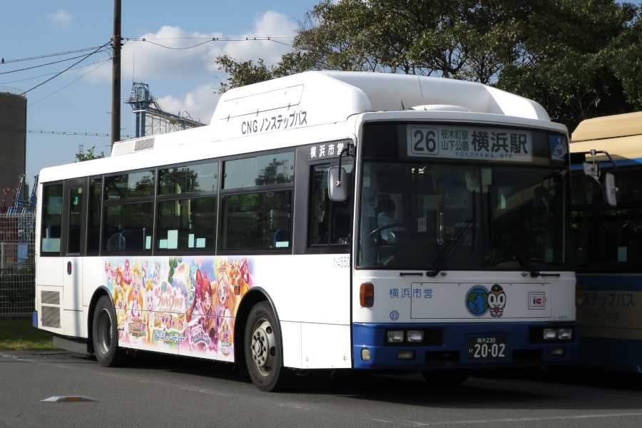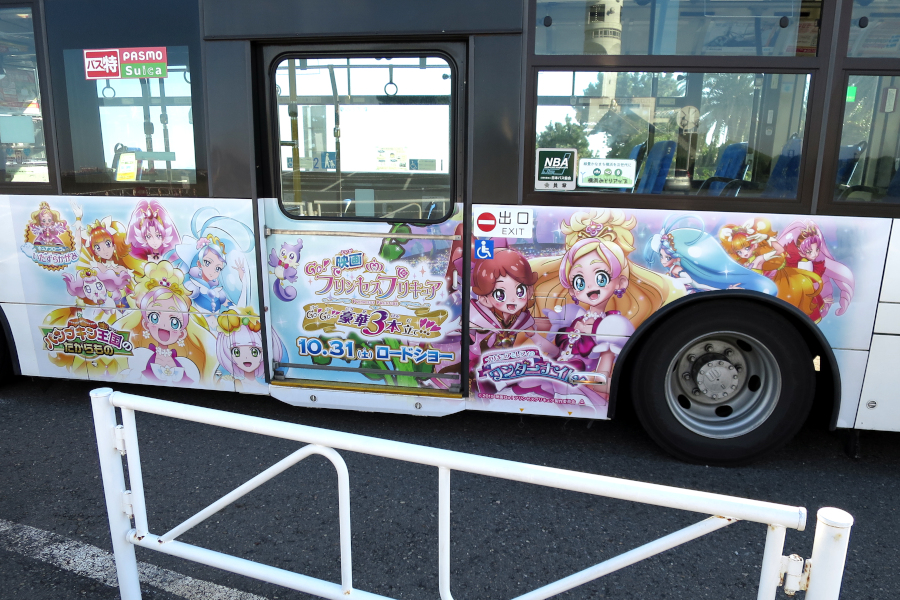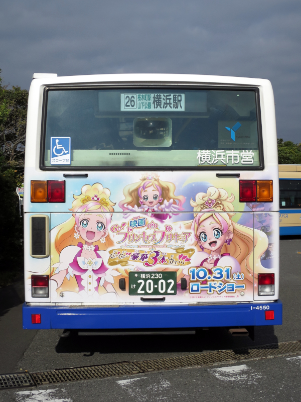 Go!プリンセスプリキュアラッピングバス(2015/11/12撮影) 「映画Go!プリンセスプリキュア Go!Go!!豪華3本立て!!!」の上映に合わせて横浜市がタイアップを実施。それに合わせてラッピングバスが運行されました。前回に比べて随分とシンプルなものとなり、内装に変更はありません。