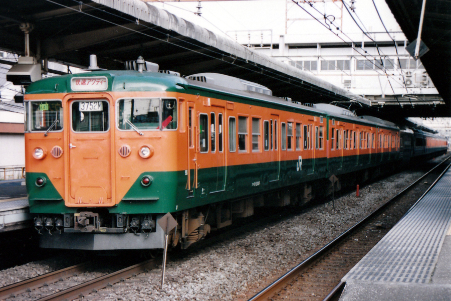 長らく東海道線の主役として君臨してきた113系の快速アクティです。後年2階建てグリーン車を連結した姿は、湘南色の編成に1両だけステンレス車体が組み込まれてひと際目立っていました。