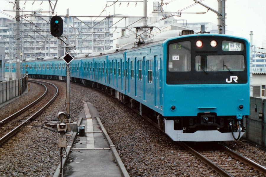 中央・総武緩行線から201系が転属してきた事もありました。スカイブルーの201系が関東では新鮮に映りました。なお前面の行先表示幕は黒地ではなく白地となっていますが、これは製造会社の勘違いによるミスだそうです。