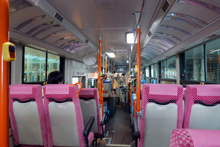 車内はハイバックシートの座席が備えられていて、中ドア付近には大型荷物置き場も設けられています。