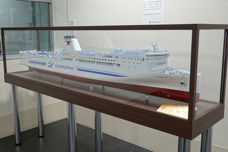 深夜出港で夜入港という事で船体外観の撮影は困難です。ターミナル受付の横に模型があったので代用。カラーリングを見てわかるように新日本海フェリーなどと同じSHKライングループの会社です。