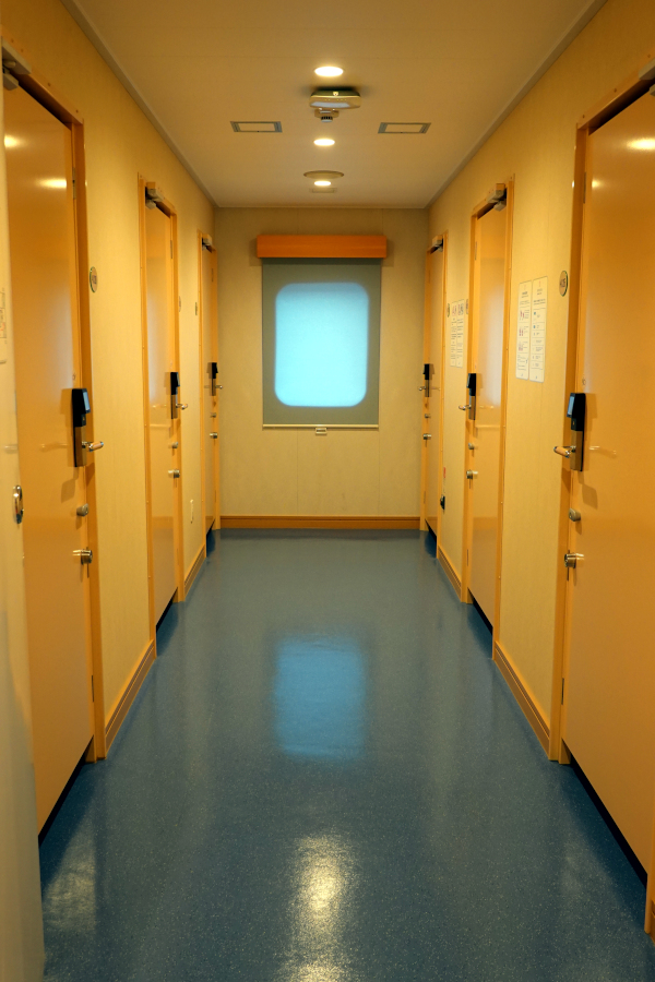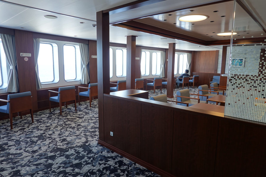 今回はツーリストSという個室を利用しました。個室内の写真を撮り忘れるという痛恨のミス…。個室内にはテレビ・コンセントなど必要最低限の設備はあります。洋上では当然電波はつながらず、事前にダウンロードしておいたYouTubeの動画も見尽くして虚無のような時間を過ごす羽目に。意図せずデジタルデトックスを体験する事になってしまいました。普段いかにデジタルコンテンツに依存していたのかを痛感しました。