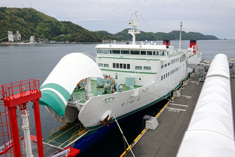 八幡浜港のターミナルの屋上から乗船するれいめい丸が見えました。思っていたより小型の船体です。