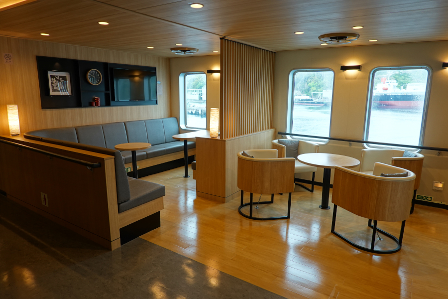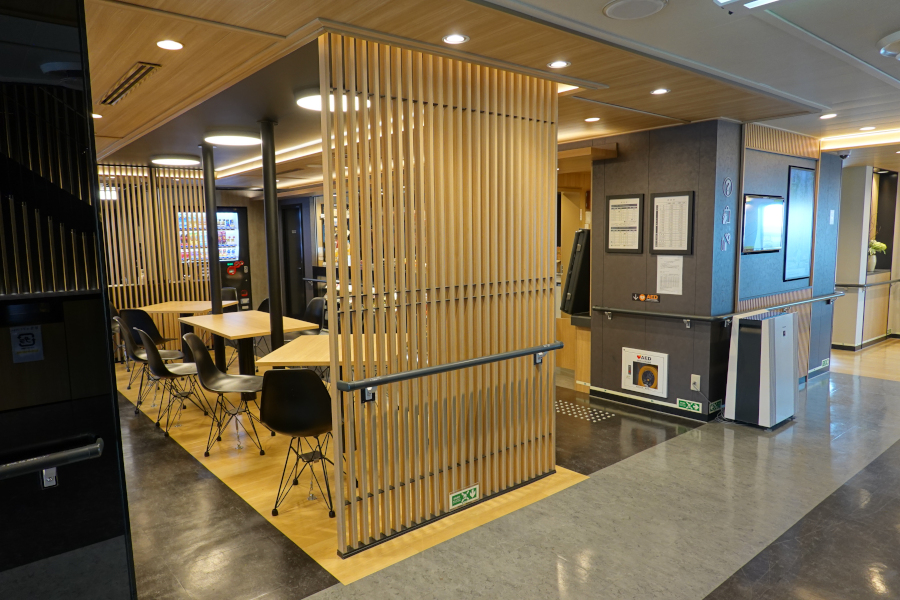 吹き抜け周囲にはグループ利用に最適なソファ席も設けられています。これらは全て2等扱いで自由席なので早い者勝ちです。ただ乗船当日は閑散としていて、20分前の改札開始と同時に乗船すれば選び放題でした。