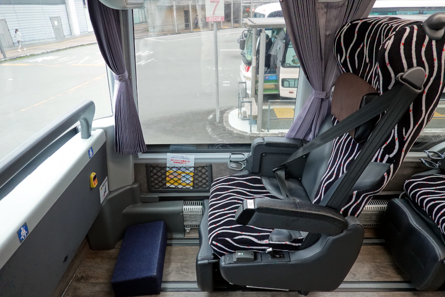 座席はリクライニングすると連動して座面が持ち上がる仕様となっています。座席の座り心地自体は良好なものの、路面の段差を通過する際の衝撃を拾いやすい傾向があるようで、乗車時間が長くなるほど不快になっていきます。正直昼行便だから許されるようなもので、夜行便だと眠るの大変だろうなぁという感想です。