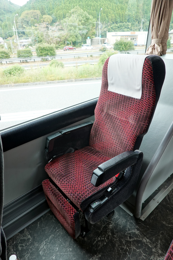 バスはやがて安富SAに13時21分に到着して1回目の休憩となりました。売店があるとはいえ想像よりもかなり小規模な休憩箇所でした。ほとんどの乗客が降車しているうちに車内観察の時間です。車内は3列独立シートで長時間の乗車でも快適です。この車両にはドライバー異常時対応システム(EDSS)が装備されていたので比較的新しい車両なのでしょう。そのおかげか非常に乗り心地が良く、路面の揺れも大きく感じずに快適でした。