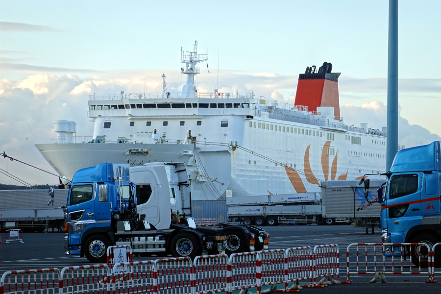 今回乗船したのは「さんふらわあ さつま」です。さんふらわあと言えば船体側面に大きく描かれた太陽のマークでおなじみですね。待合室には10名ほどいましたが、車両乗船開始のアナウンスと共に各自の車に戻っていきました。徒歩客が少ないのはシャトルバスの乗車率で把握していましたが、乗用車利用もかなり少ないようです。メインは貨物利用でしょうか?乗船開始は出港約1時間前の16時56分でした。