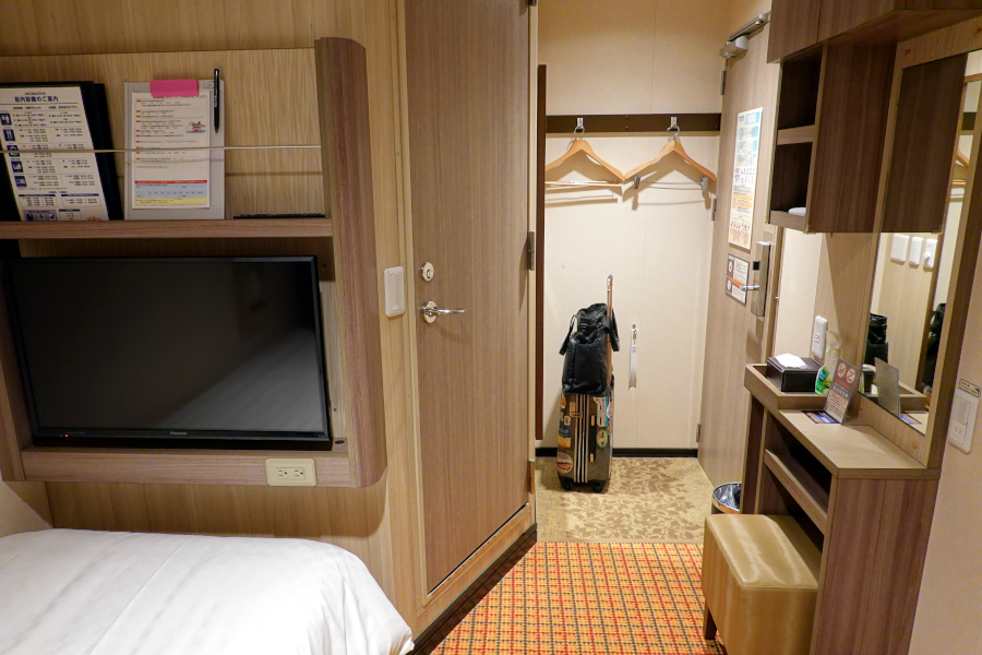 反対方向を見るとこのようにベッド付近に大型のテレビがあり、シャワー・トイレへのドアが続きます。反対にはミニデスクとチェアが設けられていますが、ノートPCも置けないくらいデスクは小さいです。