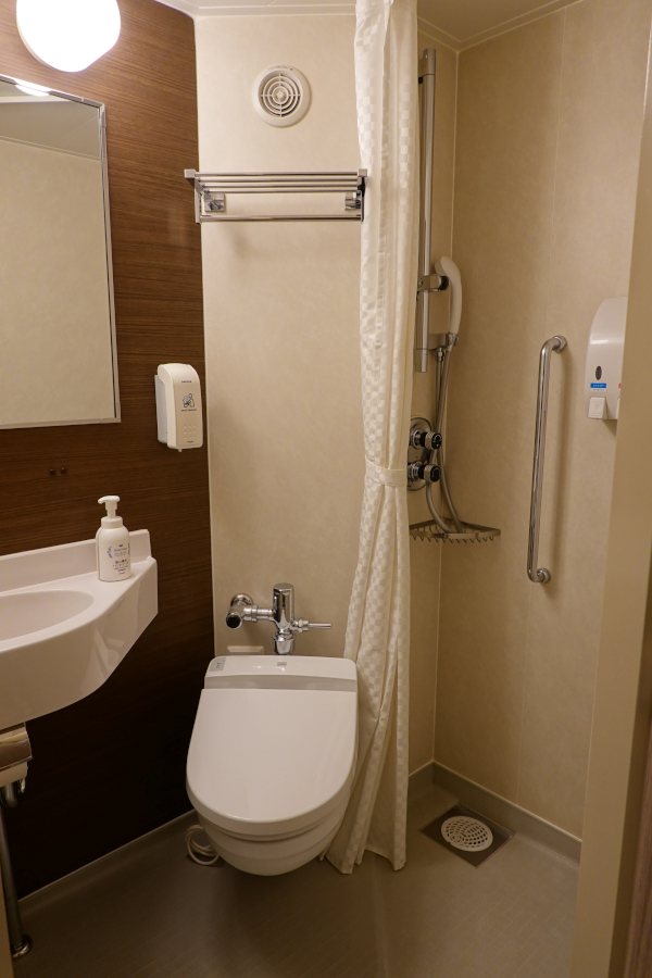 個室内に水回りがあるので非常に便利です。ただしシャワーブースはかなり狭く、身体が壁とカーテンに挟まれているようで快適とは言えません。