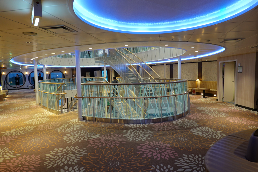 船内中央には吹き抜けがあり、階段で上下階に移動できます。周囲にはフリースペースも設けられています。
