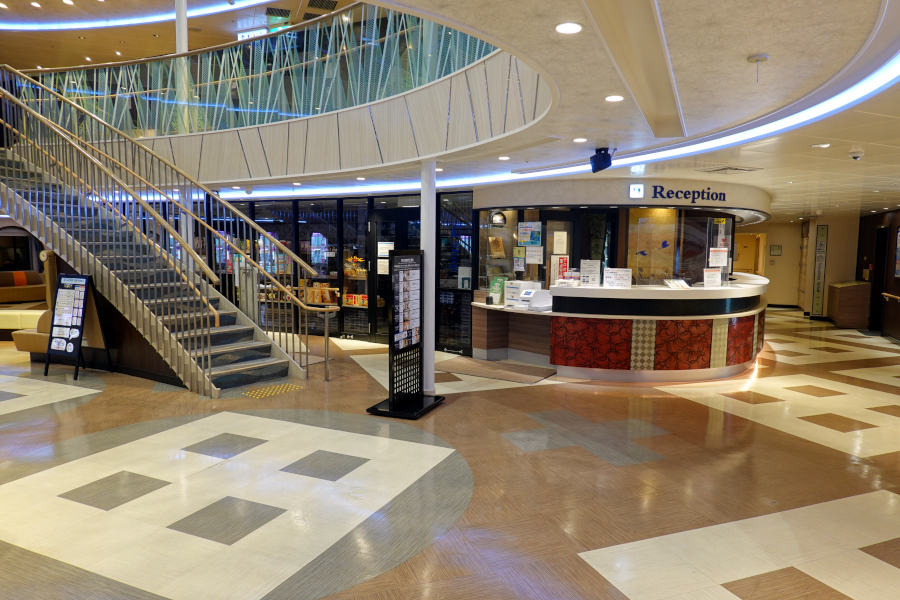 主要な施設は6階に集約されています。プロムナードにはチェアが置かれて寛ぐことが出来ます。この奥にはレストランがあり種類豊富な食事がバイキング形式で楽しめます。夕食営業開始前には開店待ちの乗客が15名ほど待機していました。
