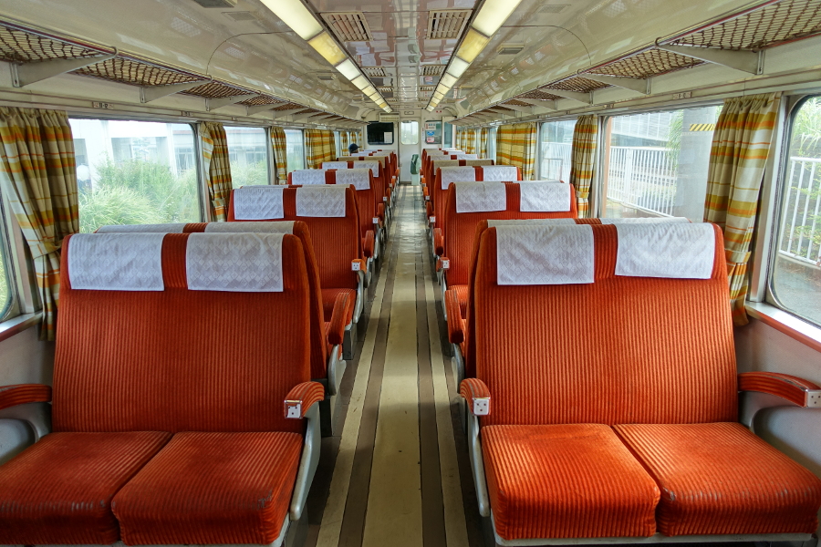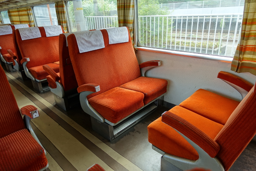 座席は詰め物がだいぶ傷んでいるようで、座り心地は国鉄通勤型のようなグシャっとした感じでした。ちなみにこの座席は背ずりが2席分で合体した造りなのでリクライニングが出来ません。特急型車両でリクライニングがしない座席、これで特急料金を徴収していたとは恐ろしい話です。