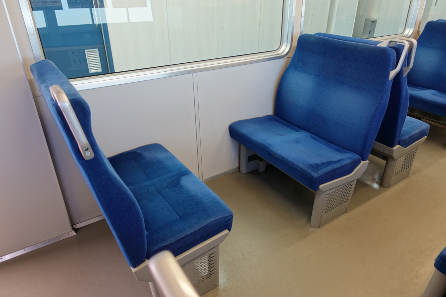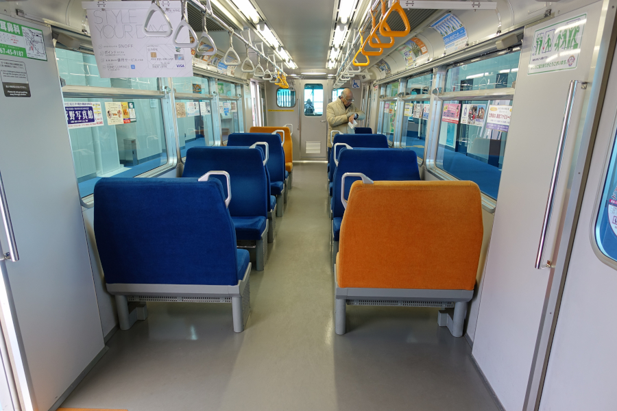 車内は全席クロスシートになっています。乗車時間15分未満の短距離路線にクロスシートを採用したのは、ロングシートで足を投げ出して通路を塞がれないようにするためか、それとも観光利用を考慮したのか、詳細は不明です。