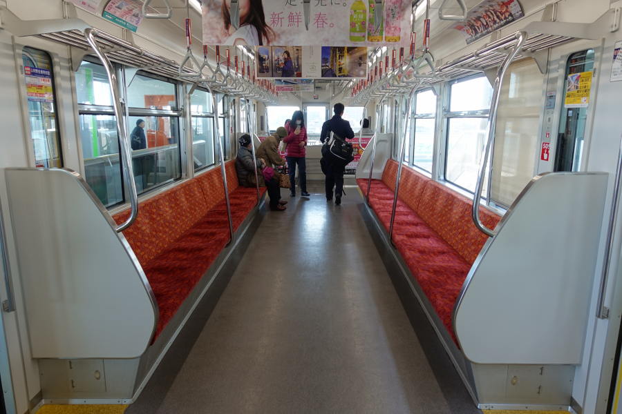 比較的短距離な路線ですが、座席はしっかりした造りで座り心地は良好です。モケットはオレンジを採用しています。写真は車端部の座席なのでありませんが、ドア間の座席には握り棒が2箇所設けられて着席定員の順守を促しています。