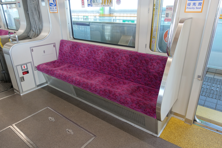 優先席のモケットは紫色が使われています。妻面には消火器も収納されています。