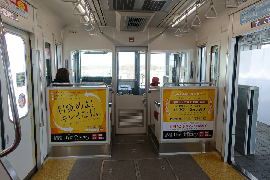 妻面はこのように独特な形状になっていて、各車両の連結面に扉が無いので開放感があります。この形状、営団地下鉄の車両にもあったような気が…。車端部には優先席や車椅子スペースが設けられています。