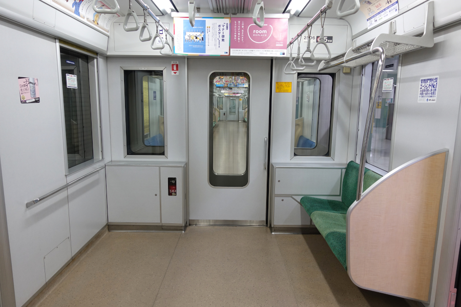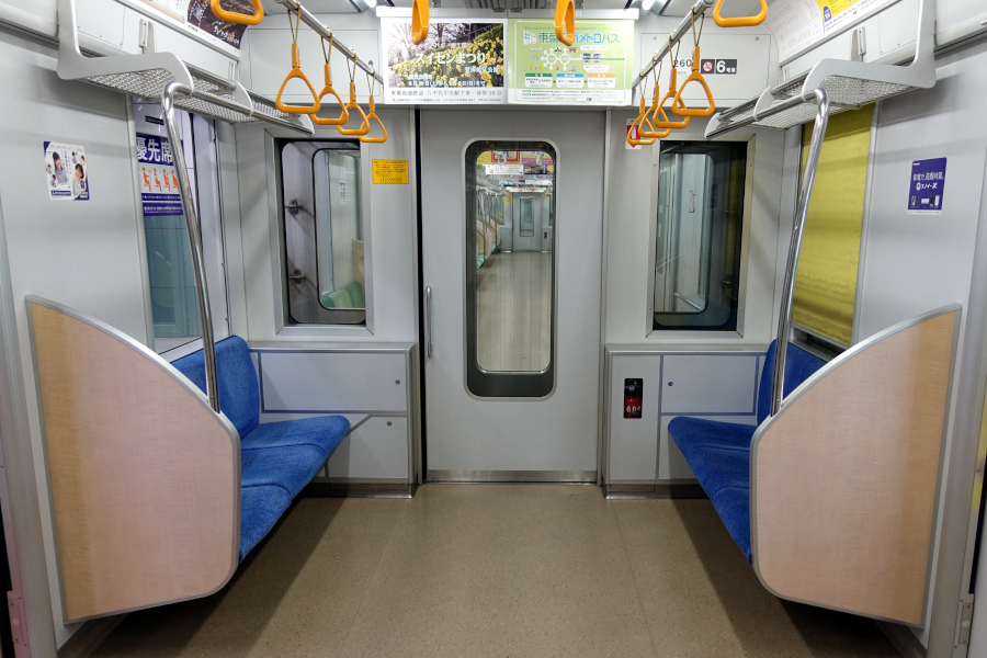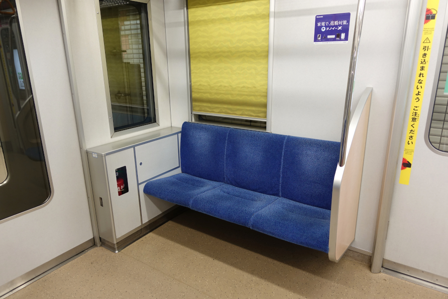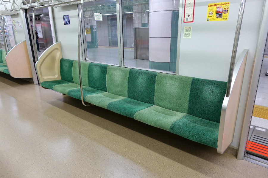 座席自体は共通設計の05N系と同一ですが、緑と黄緑を交互に配して着席定員を明示しています。座席は握り棒で3+4に分割されていて、混雑の激しい東西線内では握り棒の本数がちょっと足りないかもしれません。