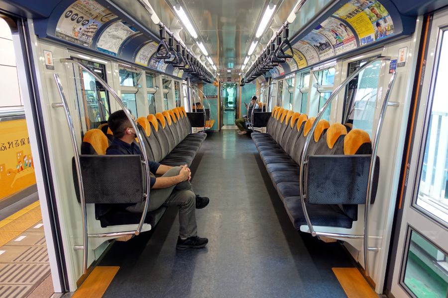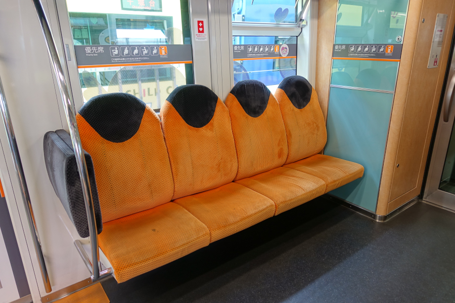 車端部は片側が優先席となっています。なお千葉都市モノレールでは貫通路は非常時以外の通行は出来ません。