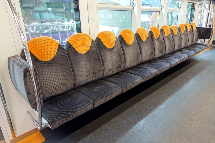 車内はオールロングシートで、握り棒が少なく中づり広告が無いので開放感があります。ドア横の手すりは弧を描いた独特の形状となっています。