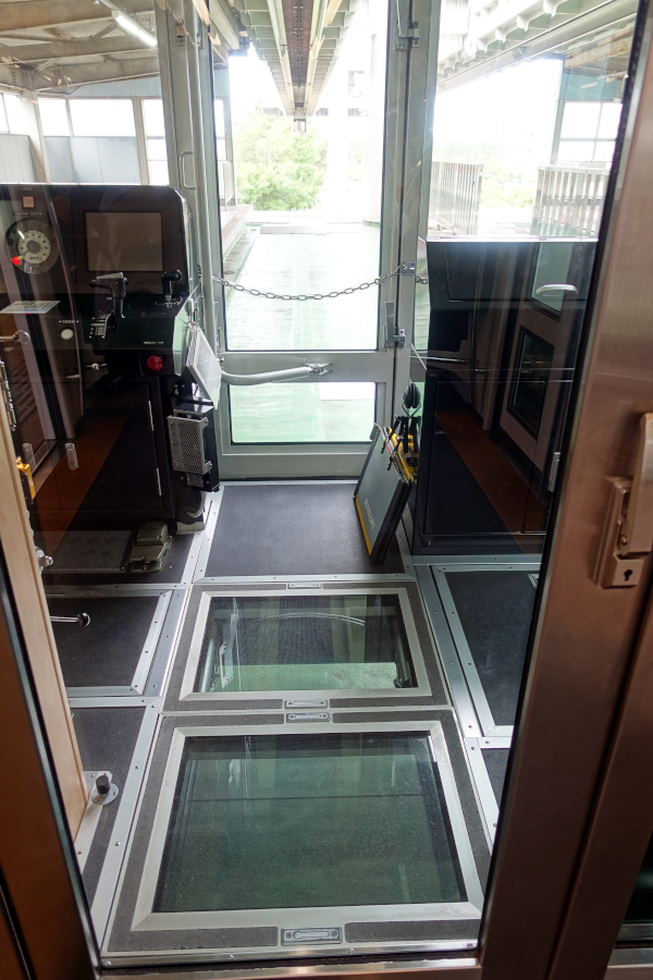運転室中央の床面はなんとガラス張りで、前方だけでなく下方の眺望も楽しめるという驚きの仕様となっています。