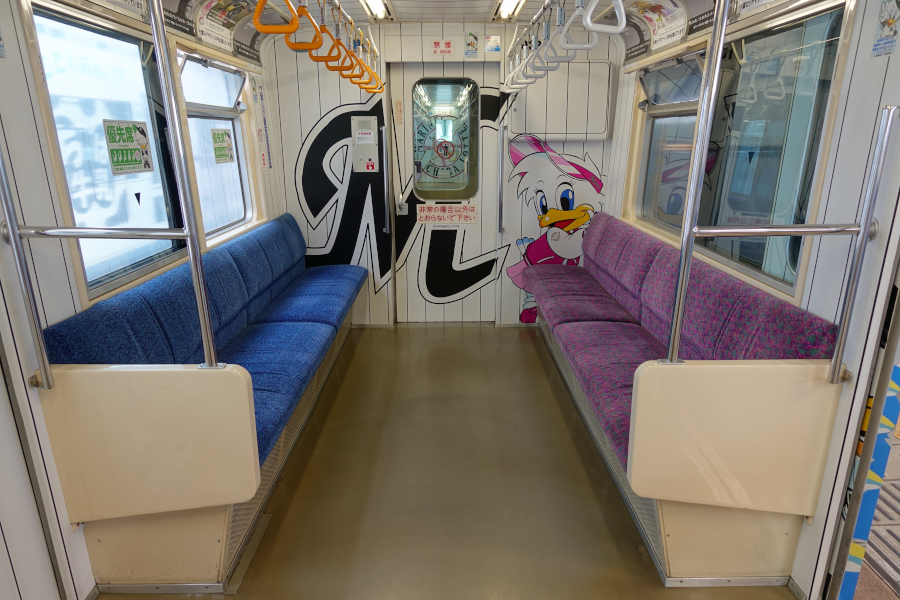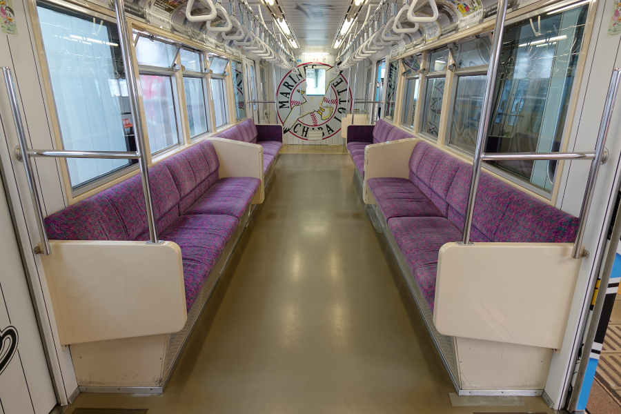 車端部には優先席が設けられています。妻面には窓は設けられてなく、ラッピングが施されています。なお貫通路は非常時以外は通行できません。