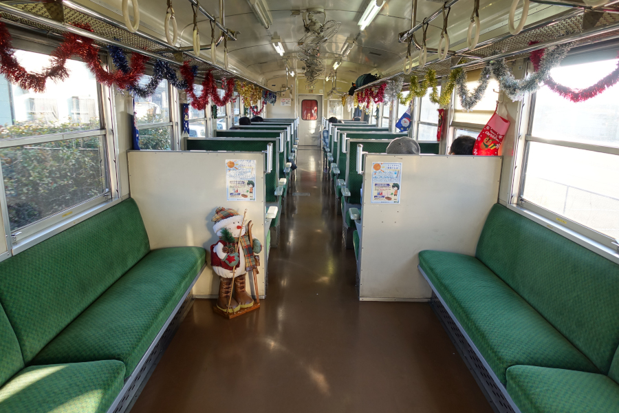 客車の車内はクリスマス仕様の装飾が施されていました。デッキ付近がロングシートで、それ以外はボックス席となっているThe国鉄型といった雰囲気の内装です。現存する50系客車の中でも限りなく原型に近い姿を残す希少な車両です。