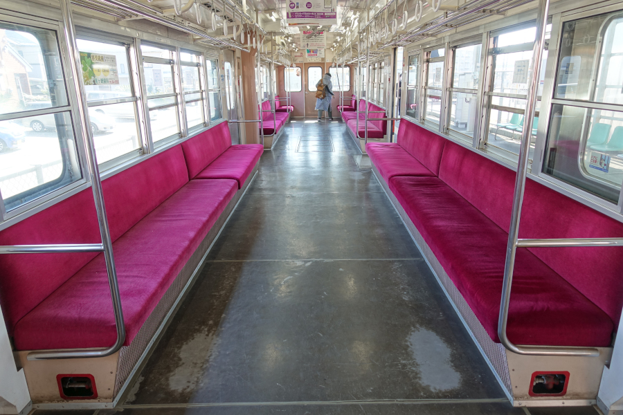 座席は昔ながらのフカフカした座り心地で、8~9人掛けでしょうか。車齢40年を超えてなお現役で活躍していますが、車両の状態は良好に思えます。