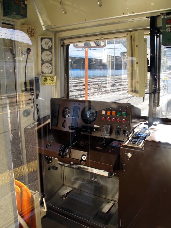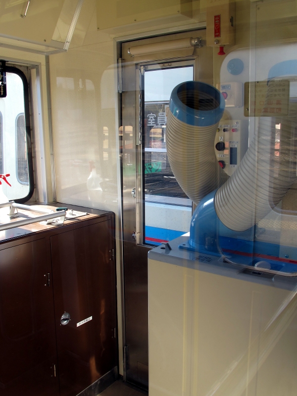 運転室の空調装置はなんとスポットクーラーが室内にドカンと置かれています。まぁ客室側にはみ出ているわけでもないので乗客にとっては不満は無いのでしょうが、個人的には雑な改造と感じた次第です。