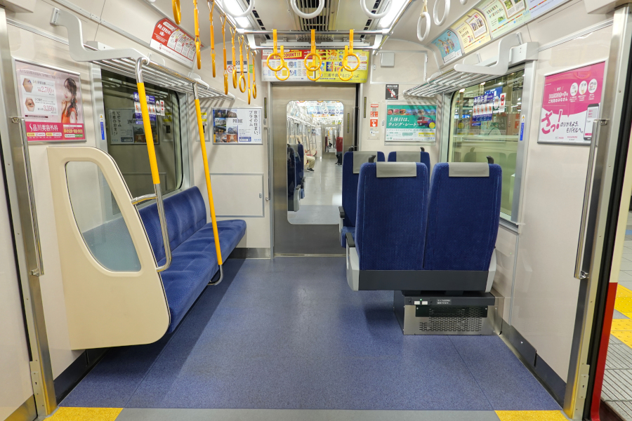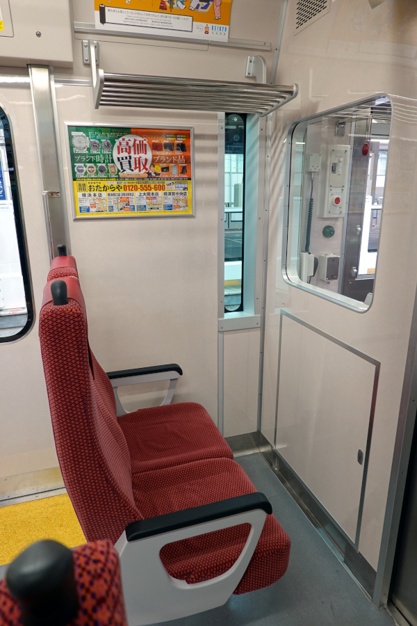 車端部はボックス席とロングシートの組み合わせですが、一般席はロングシートが2人掛けに減らされてフリースペースが設けられています。健常者を迫害する座席設定ですが、これが今後のスタンダードになるのでしょうか?