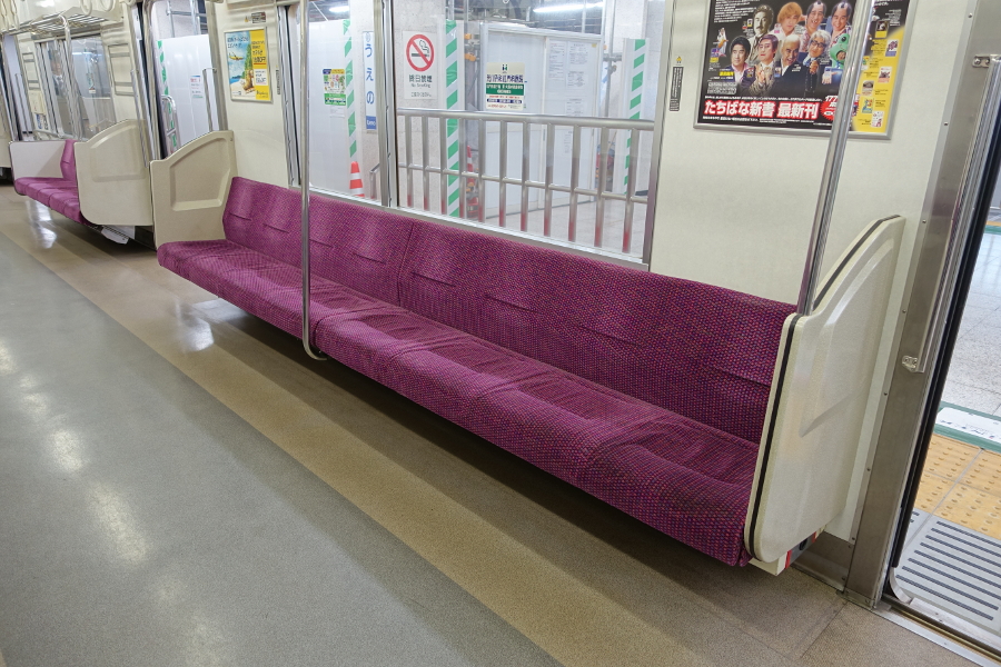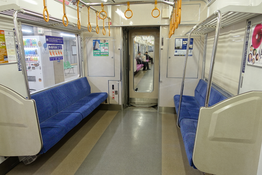 車端部も特に変化ありません。消火器は妻面に上手に収納されています。非常時に目立ちにくい気もしますが。座席を仕切る握り棒が片側にしか設置されていないのは何故でしょう?