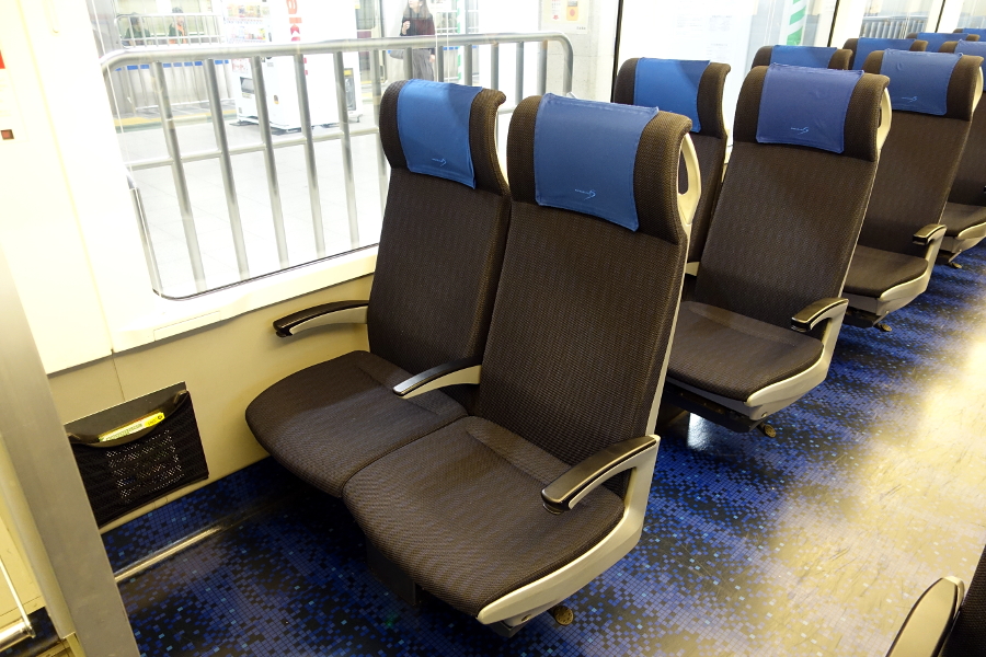 座席は家具メーカーとして有名な岡村製作所が担当し、従来車よりもシートピッチが拡大されています。ちょっと肘掛けが短いのが難点か。