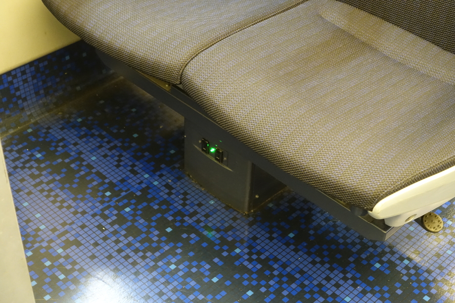 座席下にはコンセントが装備されています。ちょっと分かり難い場所で、肘掛けに装備されている成田エクスプレスに劣っている点かもしれません。