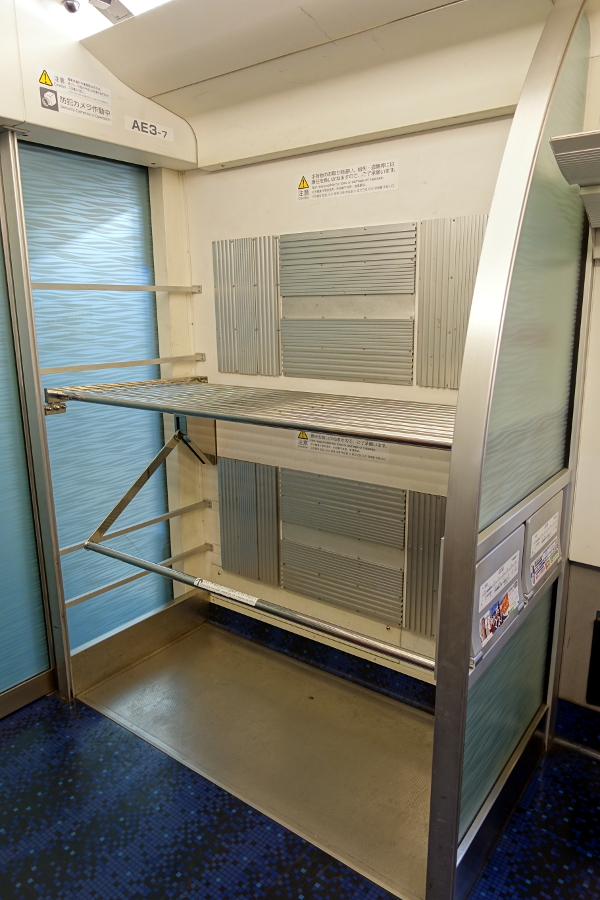 デッキ寄りには大型荷物置き場が設けられています。上段に置いた荷物は押さえるものが無いので落ちそうで心配です。車内防犯カメラも装備されて安全性も確保しています。