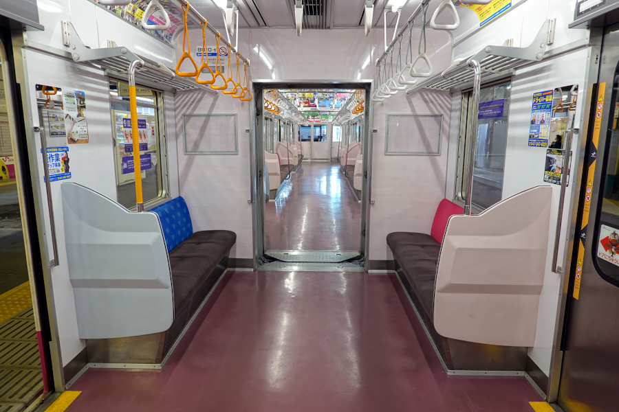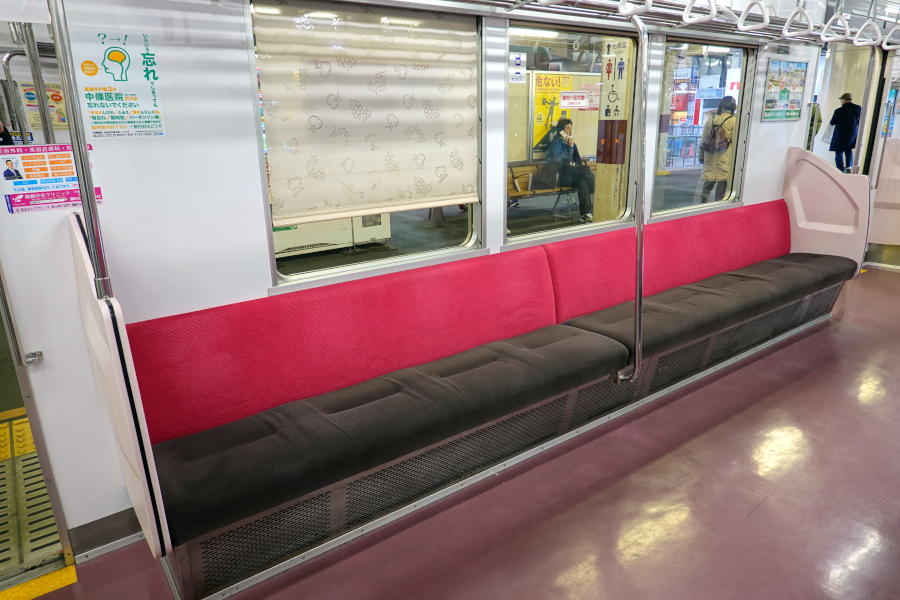 車端部には優先席が設けられています。新京成では両車端部の半分が優先席となっています。分かりにくいですが袖仕切りの色も異なっています。
