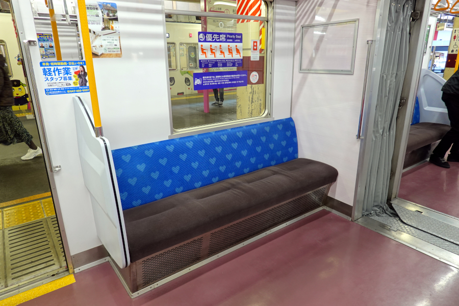 優先席のモケットは青系統にハートマークの柄が入っています。色的には一般席と色を交換した方が良い気もしますが、ピンクはコーポレートカラーなので仕方ないのかもしれません。