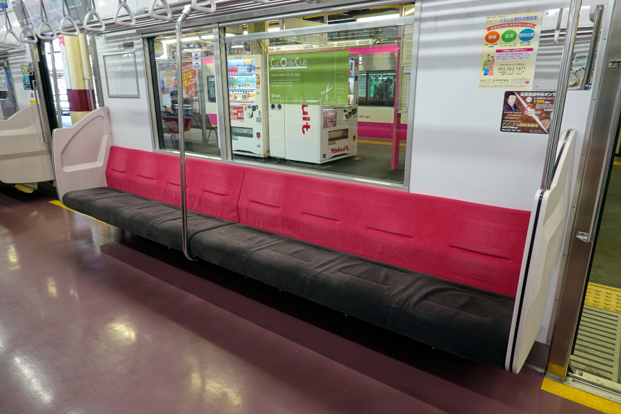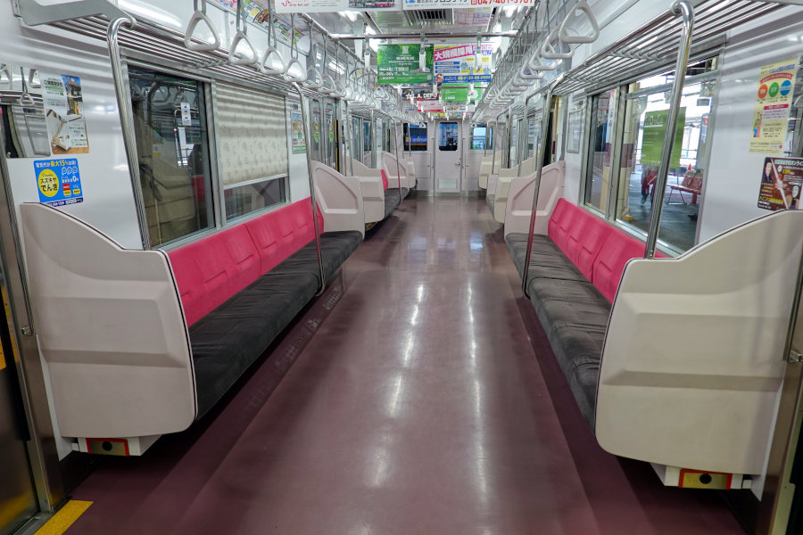 車内は関東私鉄でよく見るような雰囲気となっていますが、座席背ずりが明るい色な点が特徴です。京成とは異なり本形式ではつり革の形状が三角形となっています。