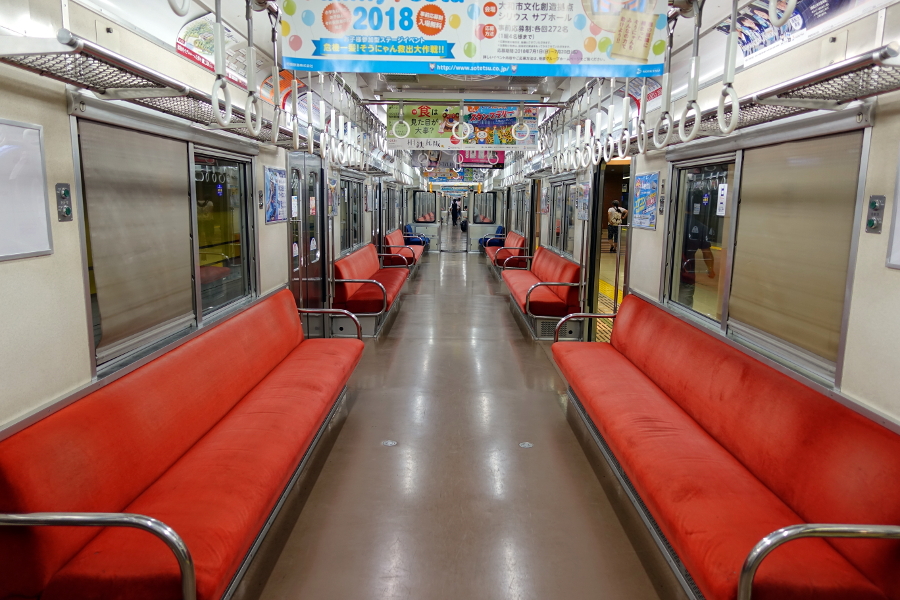 車内はオールロングシートになっています。ドア横を除いて握り棒は無く、車内は非常に開放感があります。荷棚は昔ながらの金網式です。この車両の側窓はなんと電動式になっています。電動で窓が開閉するという鉄道車両では極めて珍しい装備です。