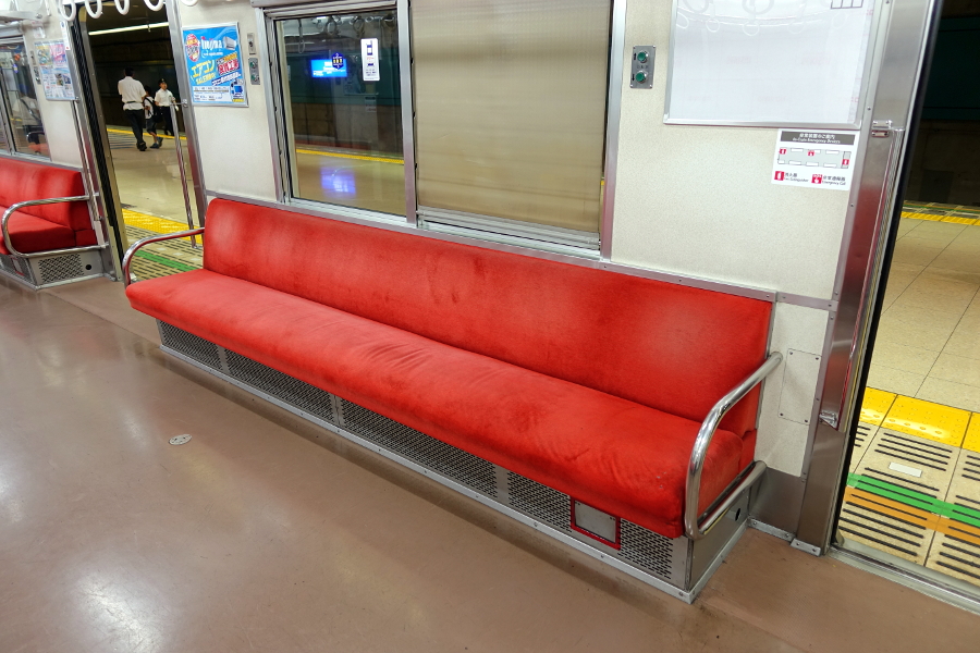 座席は国鉄型のようなグシャっとした座り心地です。相鉄線は終点まで乗り通しても30分ほどなので、必要十分な座り心地と感じます。袖仕切りは丸パイプをU字にしたシンプルなものです。側窓の脇には開閉用のスイッチが設けられています。