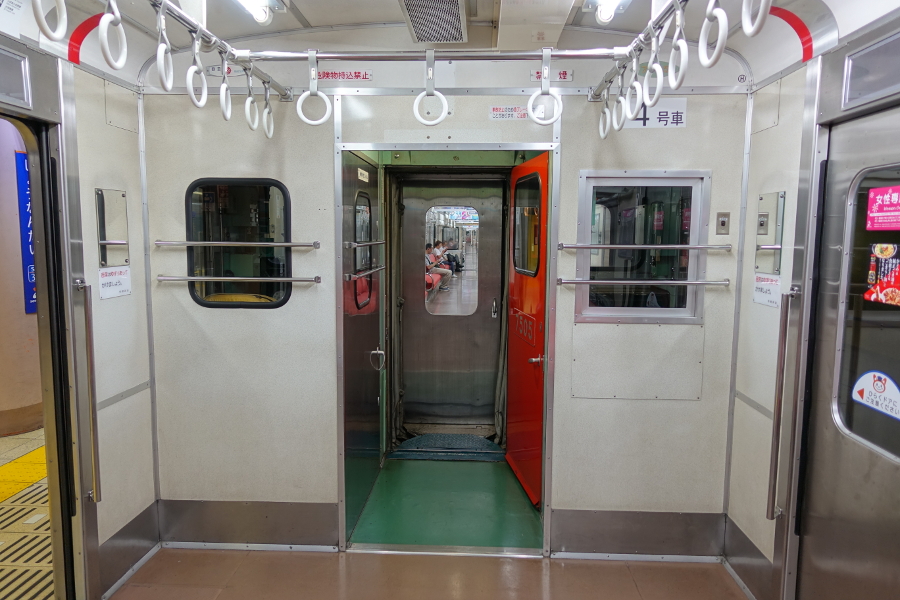 車内から見るとご覧の通りです。ドア横には何故か鏡が設置されています。昭和30年代に活躍していた5000系電車から採用され続けている伝統の装備のようで、身だしなみを整えられるようにとの配慮によるものだそうです。JRベースの車両には装備されていませんでしたが、最新型の20000系でこの鏡が復活しています。