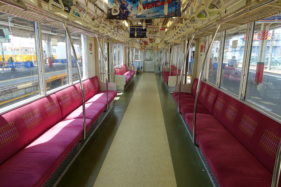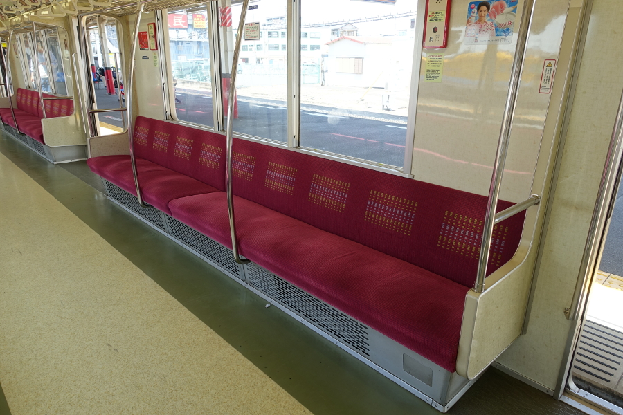 この車両は全長18メートルの3ドアなので座席のロングシートが長く感じます。側面の3連窓は中央が固定式で両側が下降式になっています。近年の車両なら2連窓になりそうですが、3連窓になったのは強度的な問題なのでしょうか?ちなみに東武の日比谷線直通車は4連窓だったりします。