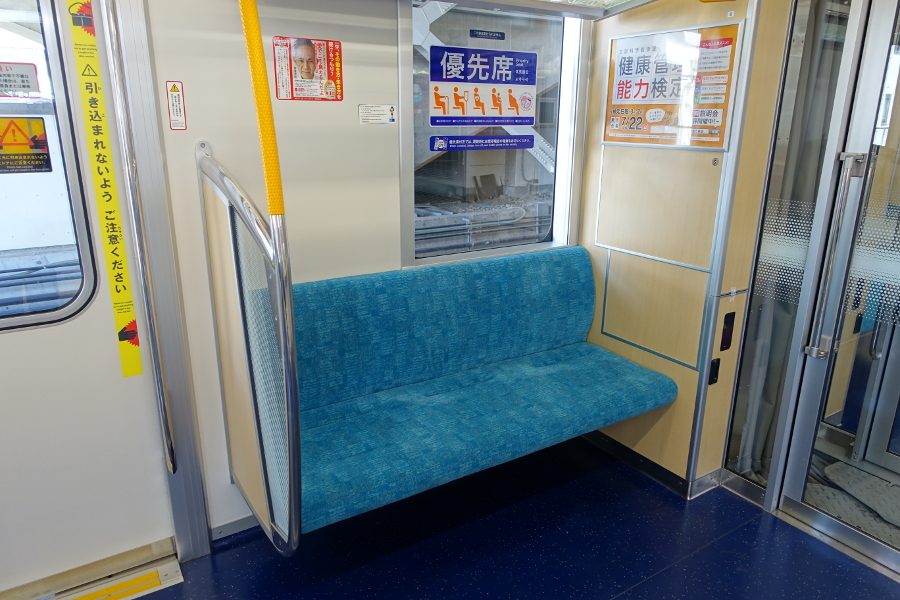 優先席は水色の座席になっています。分かり難いですが貫通路横には消火器が設置されています。いざという時に使えるようもう少し分かりやすい掲示があれば嬉しいのですが。