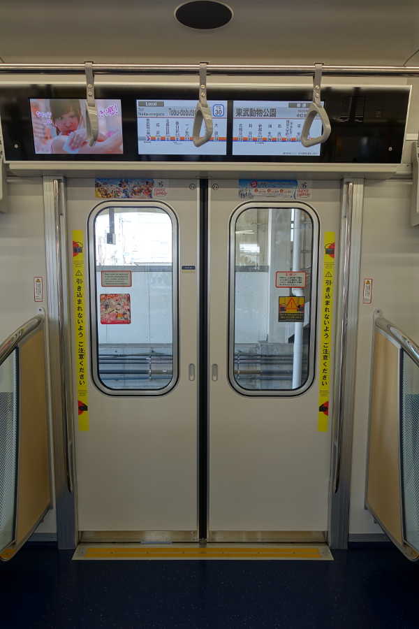 車端部は木目調の壁面になっています。貫通路は全面ガラスで非常に開放感があります。扉はアシストレバーが付いているので簡単に開くように改良されています。13000系では各車両にこのようなフリースペースが設けられているのですが、立客が寄り掛かれるように腰当てバーが設けられています。窓の周囲に握り棒が設置されているのですが、これはちょっと使い道が分かりません。