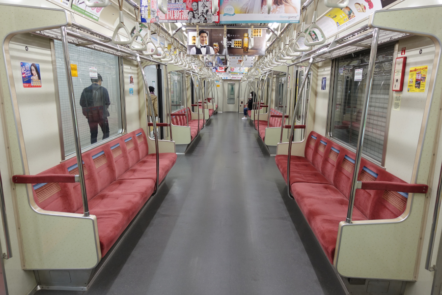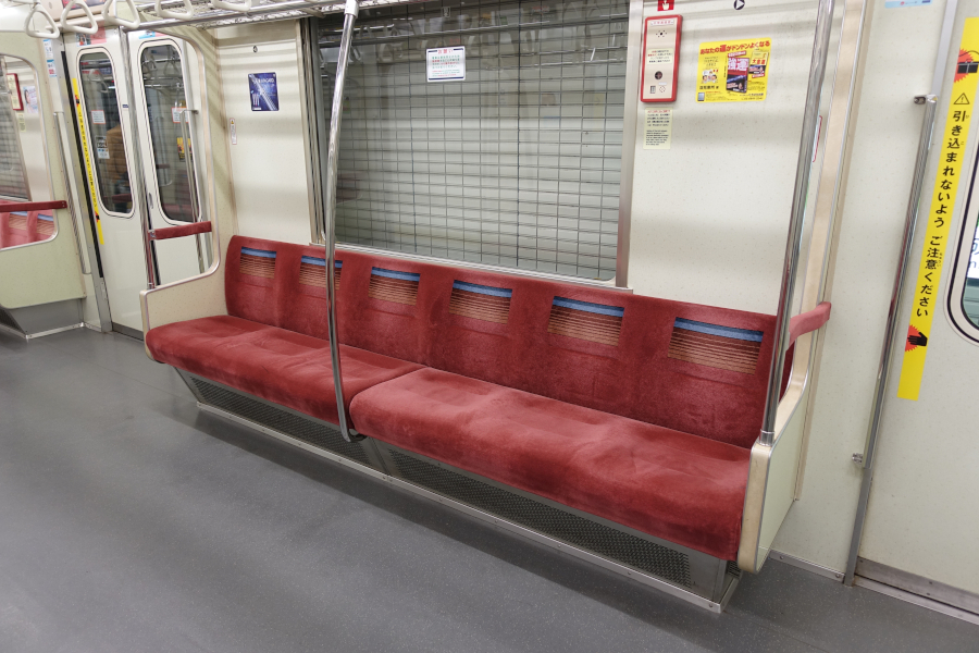 東西線のラインカラーは青系なのですが、座席のモケットは赤系となっています。座席はバケットタイプですが詰め物が痛んでいるようで座り心地はいまひとつです。硬いよりはマシですが。座席を仕切る握り棒は後年設置されたものでしょうか?