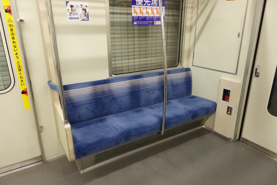 車端部には優先席が設けられています。妻面の右側には妻窓を埋めた跡のようなものがあります。