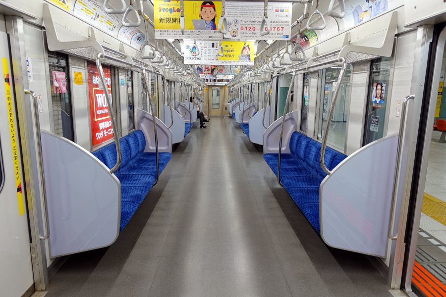 従来の東西線車両とは異なり、車内は寒色系となっています。袖仕切りは大型ながら丸みを帯びているので圧迫感はありません。ここから見ると従来車と大差無いように見えます。