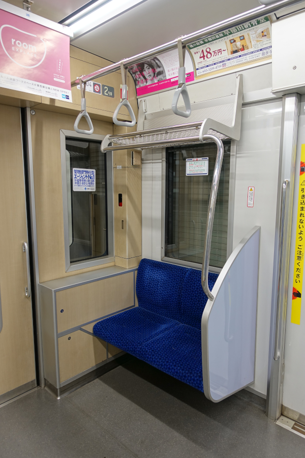 戸袋窓も設けられているので車内は開放感があります。ドア開口幅が広いのでドア間の座席は6人掛けと少なめです。座席はバケットタイプで中央には握り棒が設けられています。