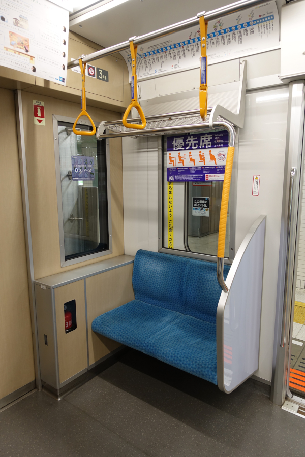 こちらの車端部には優先席が設けられています。吊革や手すりがオレンジ色で区別されています。