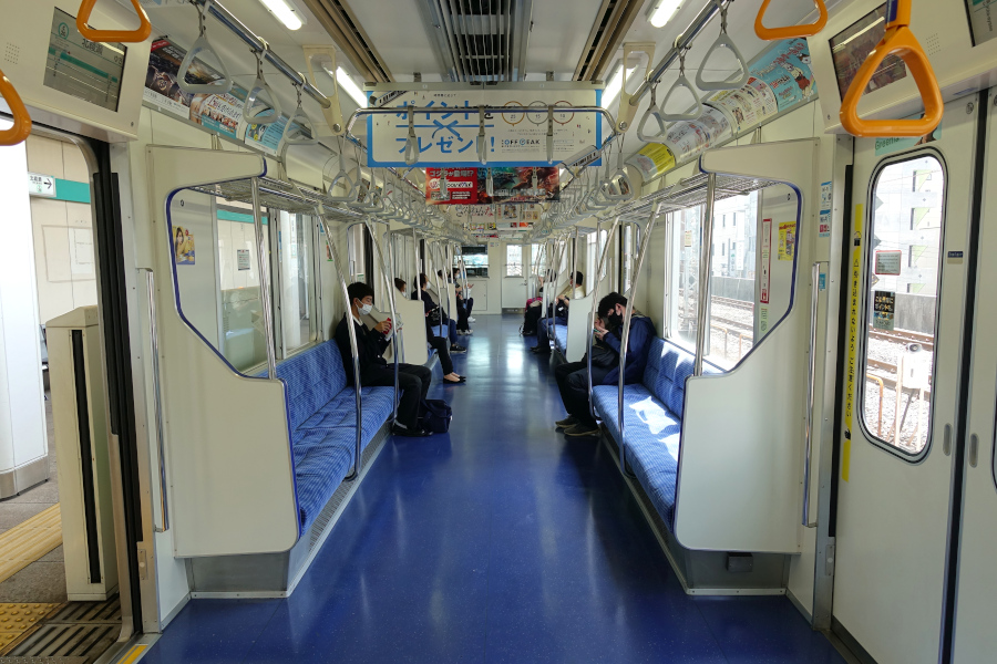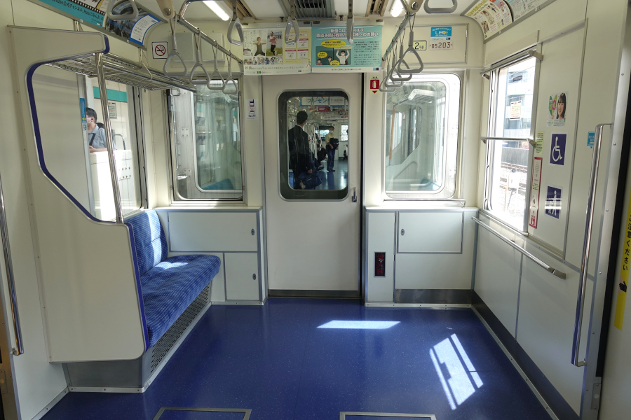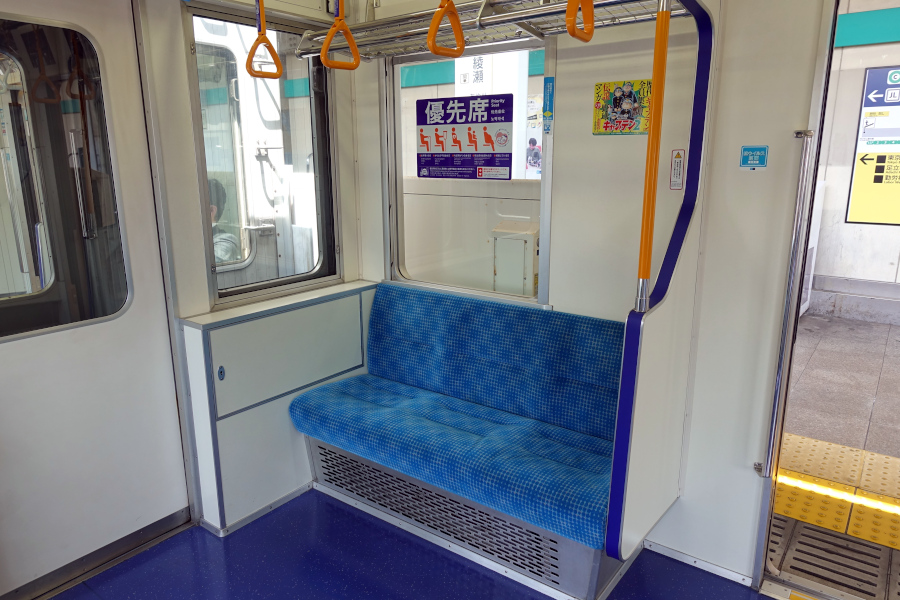 内装は9000系B修工事施工車の色違いといった雰囲気で、16000系と同じく青色を基調としたデザインになっています。わずか1駅間を所要4分で結ぶ超短距離運用に就いていますが、全てのドア上にはLCD表示機を2画面装備して本線と遜色ない仕様です。
