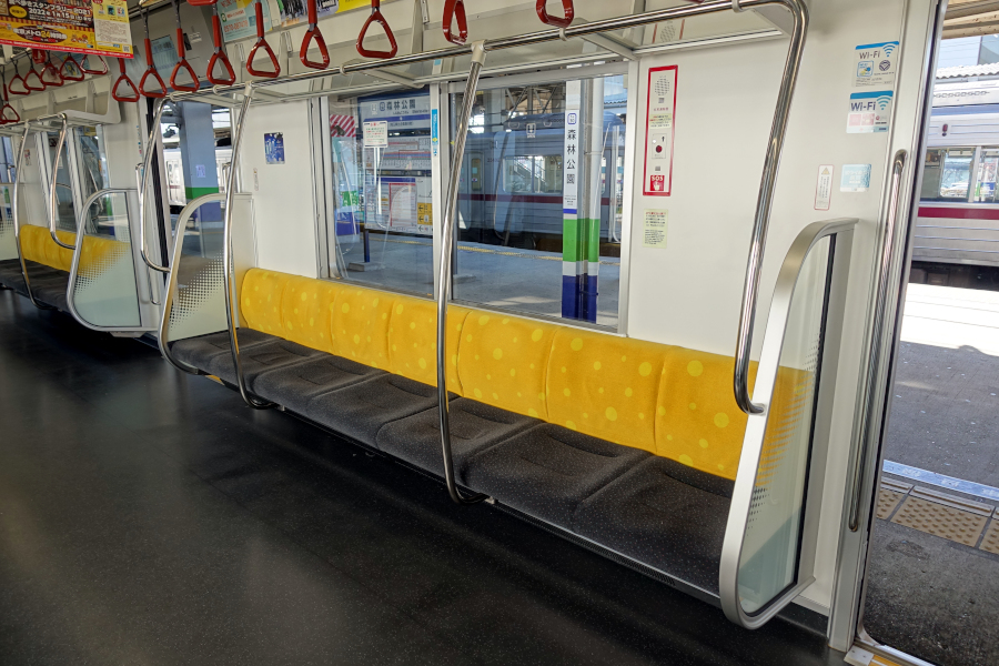 黒色の床面に白色の壁面が目立つ車内で黄色の背ずりがアクセントになっています。座席は握り棒で2+3+2に分割されています。